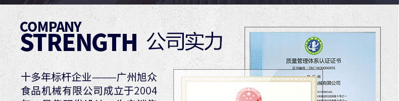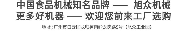 廣州旭眾食品機械有限公司是一家集科研開發(fā),生產(chǎn)設計,營銷服務為一體的現(xiàn)代化生產(chǎn)企業(yè)?,F(xiàn)代化生產(chǎn)車間,精湛制造技術,所產(chǎn)機械歷經(jīng)市場重重考驗,不斷贏得海內(nèi)外客戶的贊譽。