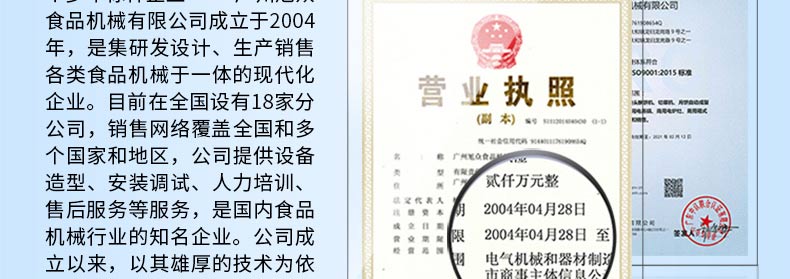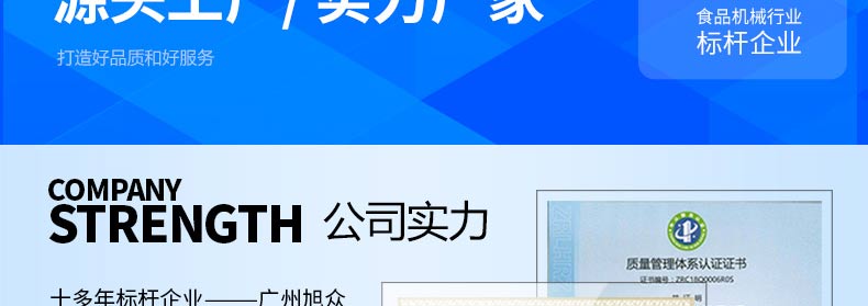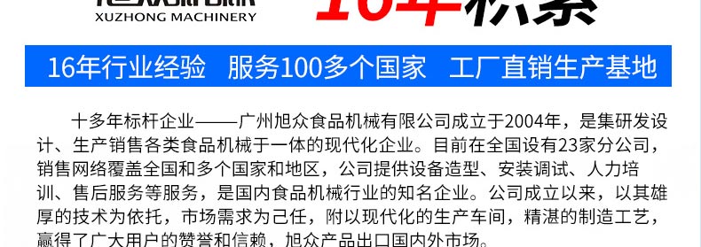 廣州旭眾食品機(jī)械有限公司是一家集科研開發(fā),生產(chǎn)設(shè)計(jì),營(yíng)銷服務(wù)為一體的現(xiàn)代化生產(chǎn)企業(yè)?,F(xiàn)代化生產(chǎn)車間,精湛制造技術(shù),所產(chǎn)機(jī)械歷經(jīng)市場(chǎng)重重考驗(yàn),不斷贏得海內(nèi)外客戶的贊譽(yù)。