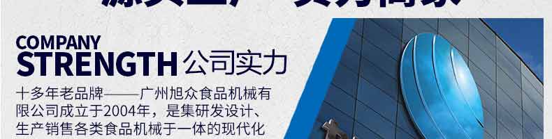 廣州旭眾食品機(jī)械有限公司是一家集科研開發(fā),生產(chǎn)設(shè)計(jì),營銷服務(wù)為一體的現(xiàn)代化生產(chǎn)企業(yè)?,F(xiàn)代化生產(chǎn)車間,精湛制造技術(shù),所產(chǎn)機(jī)械歷經(jīng)市場(chǎng)重重考驗(yàn),不斷贏得海內(nèi)外客戶的贊譽(yù)。