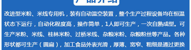 SZ-60多功能米粉機,生產(chǎn)多樣性可生產(chǎn)米粉、米線、粉絲、粉條、、年糕、玉米面條、各種雜糧粉絲、各種面條、雜糧面條、彩色面條以及以紅薯、玉米、大豆、蠶豆等制成淀粉為原料的等多種食品而且每種食品厚薄、粗細等規(guī)格可根據(jù)需要任意調(diào)整。