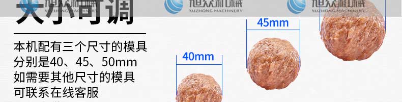 XZ-605S肉丸成型機(jī),大直徑肉丸成型機(jī),主要生產(chǎn)大肉丸、獅子頭等可訂做30-60mm的規(guī)格。輕松做好美味丸子解放雙手,輕松享受創(chuàng)業(yè)財(cái)富!