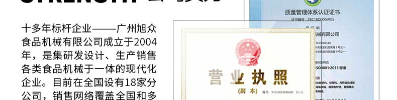 廣州旭眾食品機(jī)械有限公司是一家集科研開發(fā),生產(chǎn)設(shè)計(jì),營銷服務(wù)為一體的現(xiàn)代化生產(chǎn)企業(yè)?,F(xiàn)代化生產(chǎn)車間,精湛制造技術(shù),所產(chǎn)機(jī)械歷經(jīng)市場重重考驗(yàn),不斷贏得海內(nèi)外客戶的贊譽(yù)。